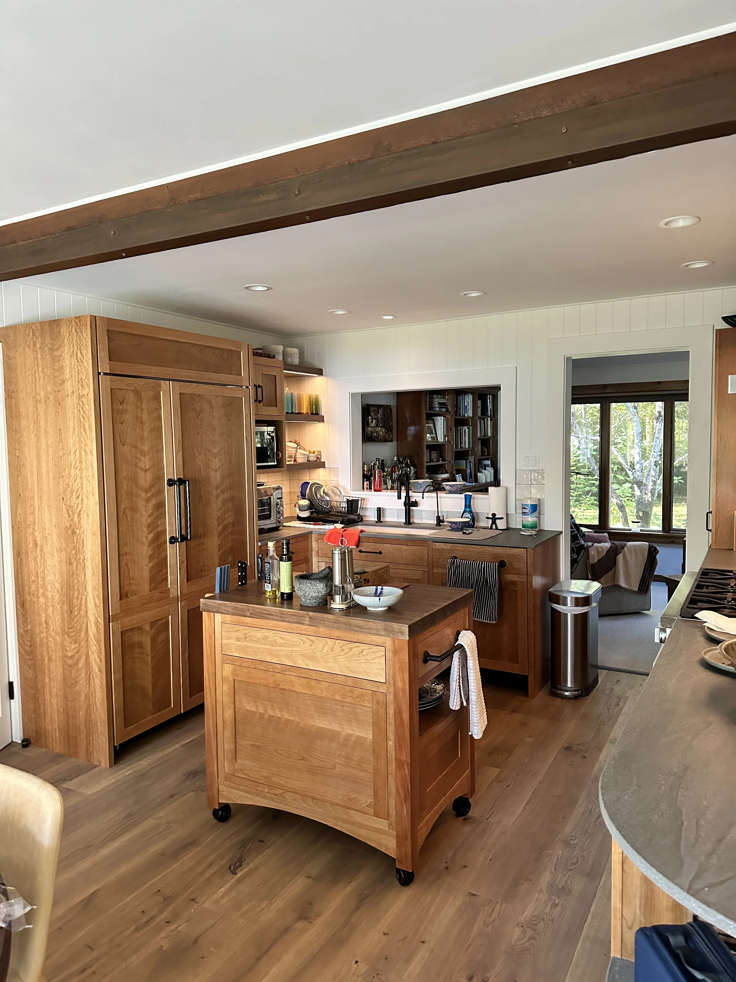 Custom cherry cabinetry, island, sideboard, and floating shelves hand-built by master craftsman Michael Akins