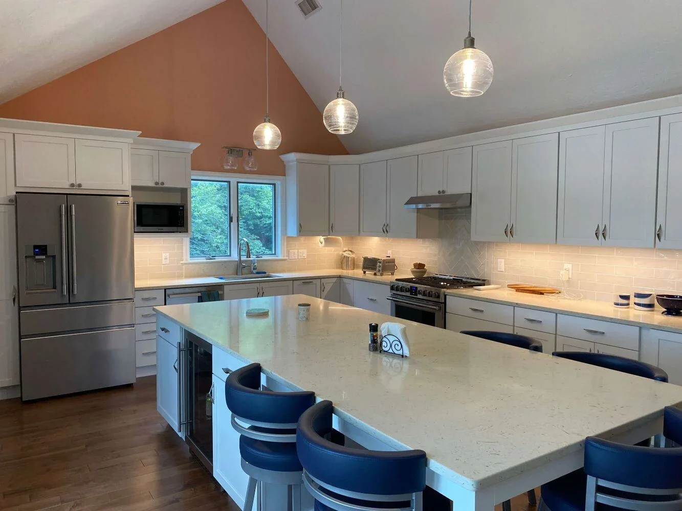 Embracing the coastal theme, bringing the outside indoors. Using the relaxing soft blue to highlight the kitchen island wood paneling and the subway wall tiles. This makes for a classic combination that matches it's surrounding perfectly.