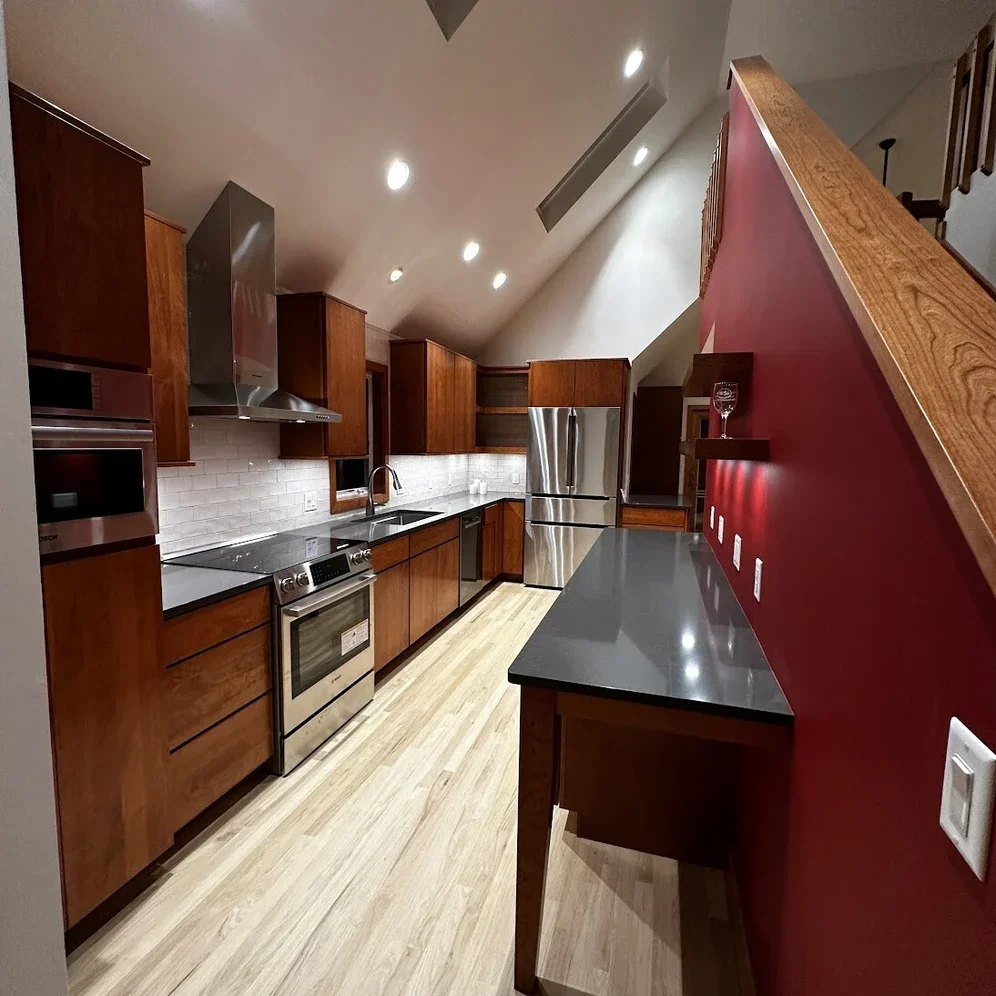 The hand-hewn tile from the Tile Bar in Brooklyn, New York, offers a dramatic backdrop to the polished countertops and custom cherry cabinets. We took extra care to ensure the microwave was positioned within the custom tall cabinet at an ideal working height. The tops and bottoms of the cabinets were finished with panels to match the faces and sides, maintaining a cohesive look. Additionally, we made and capped the stair wall on the right with a matching cherry cap.