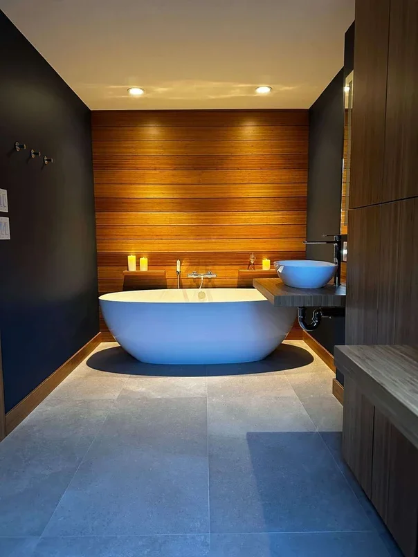 A custom-designed primary suite with bamboo cabinetry, concrete-look tile floors, and a deep soaking tub framed by a natural bamboo backdrop